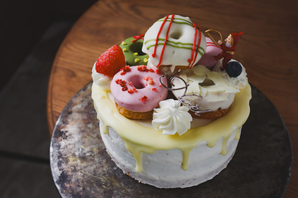 カラフルなドーナツたちが、ショートケーキの上にちょこんと乗っていて、見るだけでワクワクしちゃいます✨