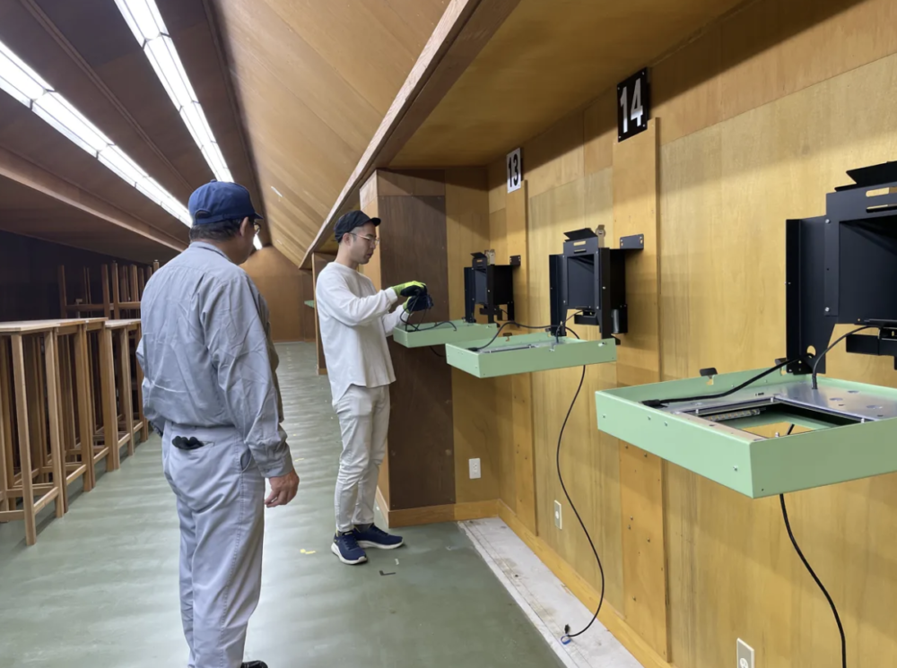 場所は愛知県射撃場。アジア大会に向けた準備ということで、本格的な機材の設置作業でした。